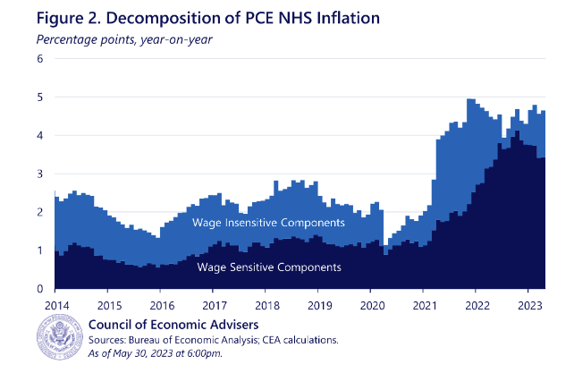 The first question is: how important is wage growth to NHS inflation? According to a blog post written by the White House Council of Economic Advisors (CEA) on May 31, 2023 that disaggregates the various components of NHS Inflation, wage-sensitive parts of sectors are responsible for 43% of "excess" annual core inflation and the vast majority of NHS inflation2.